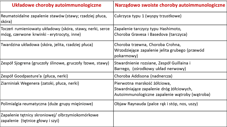 Wyróżnia się dwa główne typy chorób autoimmunizacyjnych: wielonarządowe (układowe choroby autoimmunizacyjne) oraz takie, w których tylko pojedynczy organ lub tkanka są zajęte przez proces autoimmunizacyjny (narządowo swoiste choroby autoimmunizacyjne – Tabela 1). Jednak różnica pomiędzy nimi zaciera się, ponieważ w przebiegu narządowo swoistej choroby autoimmunizacyjnej często w sposób pośredni atakowane są również inne narządy i układy.