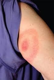 Wysypka charakterystyczna dla boreliozy, zwana również rumieniem wędrującym.