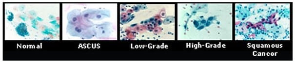 Zdjęcia przedstawiają od lewej: prawidłowe komórki (normal), atypowe komórki nabłonka płaskiego o nieokreślonym znaczeniu (ASCUS), zmiany śródnabłonkowe małego stopnia (low-grade), zmiany śródnabłonkowe dużego stopnia (high-grade) i komórki raka płaskonabłonkowego (squamous). ‍ ‍ Ujemny wynik badania cytologicznego oznacza, że pobrane komórki mają prawidłowy wygląd i nie wykryto zakażenia. Przy klasycznej cytologii czasem zdarza się, że rozmaz nie nadaje się do oceny. Oznacza to, że próbka nie była dość dobrze pobrana lub nie można było dobrze zidentyfikować komórek. Możliwe wyniki badania przedstawiono poniżej. (Więcej informacji w artykule na temat klasyfikacji wyników badania cytologicznego wg systemu Bethesda z 2001r.)