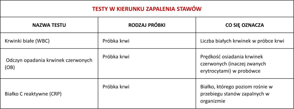 Istnieje wiele testów, które wykorzystuje się w rozpoznaniu i leczeniu zapalenia stawów. Czas niezbędny do uzyskania wyników zależy od rodzaju badania i tego, czy próbki trzeba wysyłać do analizy do specjalistycznego laboratorium. Niektóre wyniki są dostępne tego samego dnia, jednak wykonanie innych testów może zająć kilka dni lub tygodni.