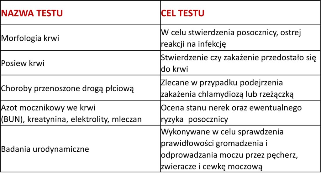 W celu wykluczenia innych nieprawidłowości w obrębie układu moczowego u pacjentów z powikłanym ZUM można wykonać dodatkowe badania obrazowe oraz badania krwi: