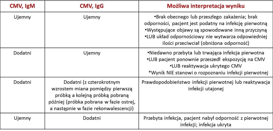 Jeżeli obecne są tylko przeciwciała IgM wskazuje na bardzo świeże zakażenie. U noworodka natomiast obecność przeciwciał IgM wskazuje, że jest to zakażenie wrodzone (nabyte w łonie matki). Jeżeli u chorego występują wyraźne objawy kliniczne natomiast ma on bardzo niskie bądź niewykrywalne poziomy przeciwciał IgG i /lub IgM może to wskazywać, że jest to inne zakażenie (nie CMV) lub że jego układ odpornościowy (układ immunologiczny) nie odpowiada na zakażenie prawidłowo i nie wytwarza przeciwciał mimo obecności wirusa cytomegalii.