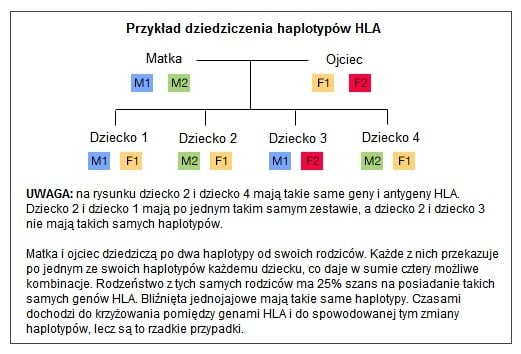 Znalezienie dawcy kompatybilnego z biorcą bywa trudne, po części z uwagi na to, że każdy gen HLA może mieć wiele możliwych form lub wariantów (alleli), czyli być polimorficzny. Oprócz tego istnieje ponad 200 genów wchodzących w skład dużej “rodziny genów” układu HLA. Wziąwszy pod uwagę wiele możliwych kombinacji oraz genów HLA, znalezienie odpowiedniego dawcy może stanowić duże wyzwanie. Jednak geny HLA zlokalizowane obok siebie, co widać na chromosomie 6 są dziedziczone łącznie jako grupy zwane haplotypami; dlatego też dziecko dziedziczy po jednym haplotypie od każdego z rodziców. Z tego powodu są większe szanse na znalezienie takiej samej grupy genów HLA u członka rodziny biorcy niż u osoby niespokrewnionej. Często najlepszym dawcą okazuje się rodzic, dziecko lub rodzeństwo biorcy.