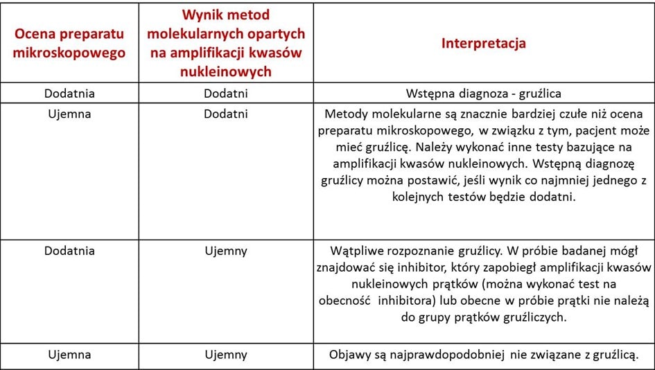 Interpretacja preparatów mikroskopowych i testów opartych na amplifikacji kwasów nukleinowych jest przedstawiona w tabeli. Każdy wynik powyższych testów musi być potwierdzony hodowlą w kierunku prątków kwasoopornych.