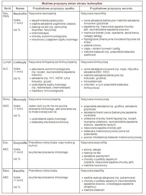 Oprócz zakażenia i zapalenia na wytwarzanie leukocytów w szpiku kostnym i czas ich przeżycia w krążeniu wpływa wiele innych zaburzeń. Wynik różnicowania leukocytów wraz z wynikami innych parametrów morfologii krwi może stanowić sygnał o toczącym się procesie chorobowym. Zwykle wykonywane są badania dodatkowe, m.in. ocena mikroskopowa rozmazu krwi obwodowej, która może ujawnić obecność komórek nieprawidłowych lub młodszych form rozwojowych leukocytów. Obecność takich niedojrzałych komórek może świadczyć o bardzo poważnych chorobach, takich jak zakażenie, białaczka, zespół lub nowotwór mieloproliferacyjny. Do młodszych form rozwojowych zalicza się m.in. metamielocyty, promielocyty i/lub komórki blastyczne.