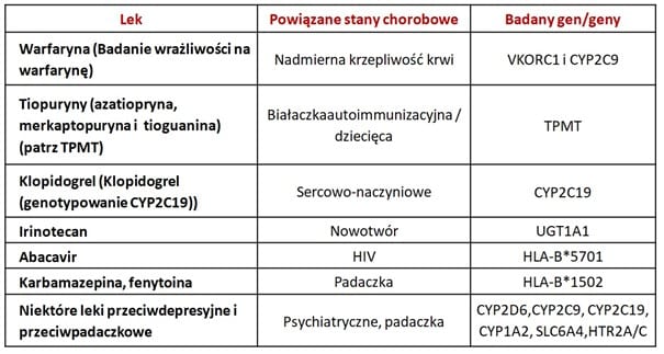 Obecnie dostępnych jest wiele testów farmakogenetycznych, których wykonanie można zlecić w warunkach klinicznych. Niektóre z nich wykonuje się tylko w określonych grupach etnicznych. W tabeli podano nazwy niektórych leków, dla których dostępne są testy farmakogenetyczne: