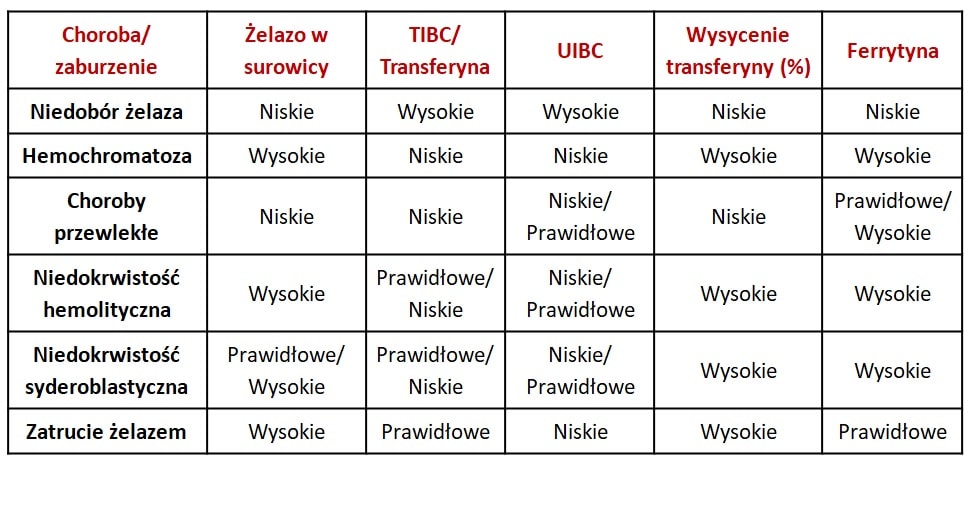Oznaczanie TIBC lub UIBC zwykle łączy się z badaniem innych wskaźników gospodarki żelazem. W poniższej tabeli zestawiono zmiany wskaźników obserwowane w różnych zaburzeniach.
