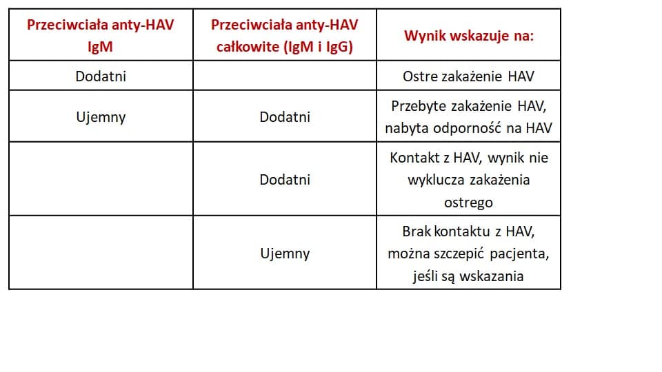 Badanie calkowitych przeciwciał anty-HAV pozwala wykryć zarówno przeciwciała klasy IgM jak i IgG, ale nie pozwala ich zróżnicować.