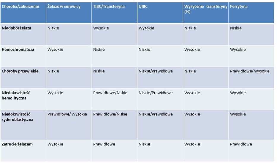 Oznaczanie stężenia żelaza w surowicy zwykle łączy się z badaniem innych wskaźników gospodarki żelazem. W poniższej tabeli zestawiono zmiany wskaźników obserwowane w różnych zaburzeniach.
