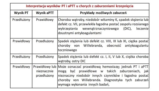 Wydłużenie czasu protrombinowego i wzrost INR świadczy o wydłużeniu czasu krzepnięcia krwi. U osób, które nie przyjmują leków przeciwkrzepliwych, a występuje u nich wydłużenie PT (wzrost INR), powinno się wykonać dodatkowe badania wykrywające przyczynę tego zjawiska. Przyczyną może być choroba wątroby, niedobór witaminy K lub niedobór czynników krzepnięcia. Wynik PT ocenia się często łącznie z wynikiem aPTT, co przedstawiono w tabeli.